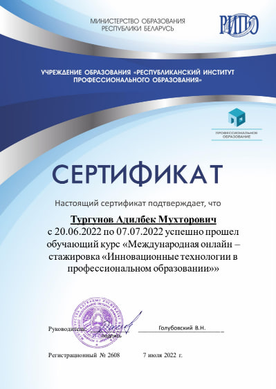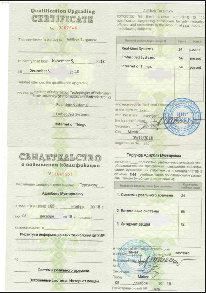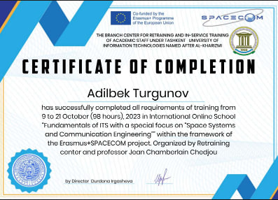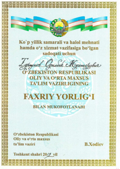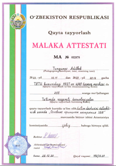 2021-2022 yy. - Muxammad al-Xorazmiy nomidagi Toshkent axborot texnologiyalari universiteti Qarshi filiali “Axborot texnologiyalari” kafedrasi dotsenti.