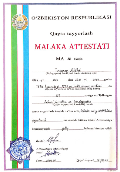 2024-x.v. - Iqtisodiyot-pedagogika universiteti NTM, “Kompyuter tizimlari” kafedrasi professor