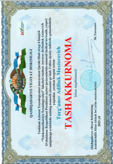 2018-2021 yy. - Muxammad al-Xorazmiy nomidagi Toshkent axborot texnologiyalari universiteti Qarshi filiali direktori
