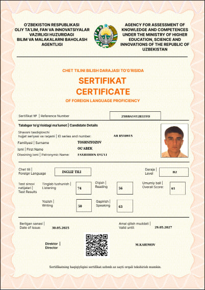 01.10.2024-01.03.2025 - “Double-Degree Exchange Program” asosida Klagenfurt Universiteti “Aqlli Tizim Texnologiyalari (Smart System Technologies)” fakulteti magistratura bosqich talabasi.